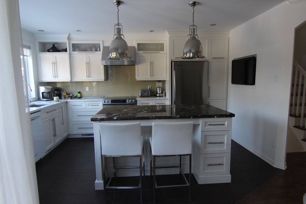 Depuis quelque temps j’avais un goût de changement dans ma cuisine.  Elle a été rénové en 2009 et j’avais alors un besoin de luminosité et d’espace claire qui m’ont inspiré un blanc intégral sur les armoires ainsi que les murs.   Après trois ans de total blanc, voici un ajout qui me plait beaucoup.  Je voulais faire oublier la télévision sortant du mur blanc. Alors il me fallait la camoufler dans le noir.  Mais un seul mur noir aurait assombrit la pièce et apporter peu d’éclat. Alors j’ai eu l’idée d’y inscrire plusieurs mots (on voit plusieurs tableaux et cadrages de mots thématiques actuellement) pour  ajouter du blanc et seulement quelques uns en  vert pour faire le lien avec les couleurs déjà présentes dans ma cuisine.  Voici ma solution!