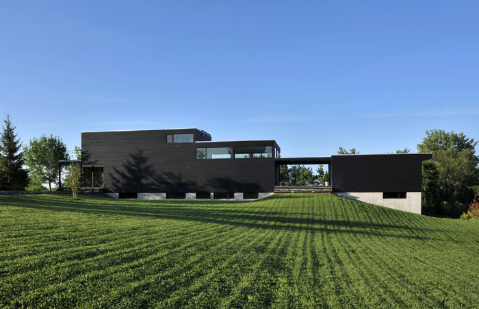 Et il n’y a pas qu’en Australie qu’il existe une maison noire! Je me suis souvenue d’une maison tout aussi spectaculaire réalisée ici au Québec. La maison d’une journaliste spécialisée en design et en architecture : Lucie Lavigne! Avec l’aide de l’un de nos architectes les plus intéressants au Québec, Pierre Thibault (un des rares à oeuvrer au niveau résidentiel en plus de réalisations de plus grande envergure), cette magnifique maison a pris forme sur un emplacement de choix et ils ont opté pour un noir total eux aussi ! Et c’est parfaitement réussi! Les lignes de la maison sont sublimes et j’aime l’impression qui s’en dégage. Cette maison est tout aussi magnifique que celle d’Australie! Qu’en pensez-vous?