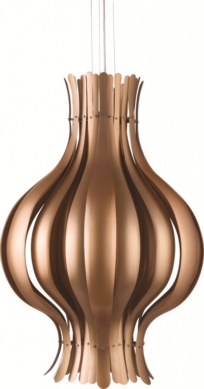 La suspension Onion Verpan, de Verner Panton, designer danois (1926-1998). Non seulement elle est de couleur cuivre mais elle est en cuivre! (ce qui augmente considérablement son coût!) Ce luminaire est rigolo, voir ludique, enfin bref, un bel exemple qu’un luminaire peut être autre chose qu’invisible!