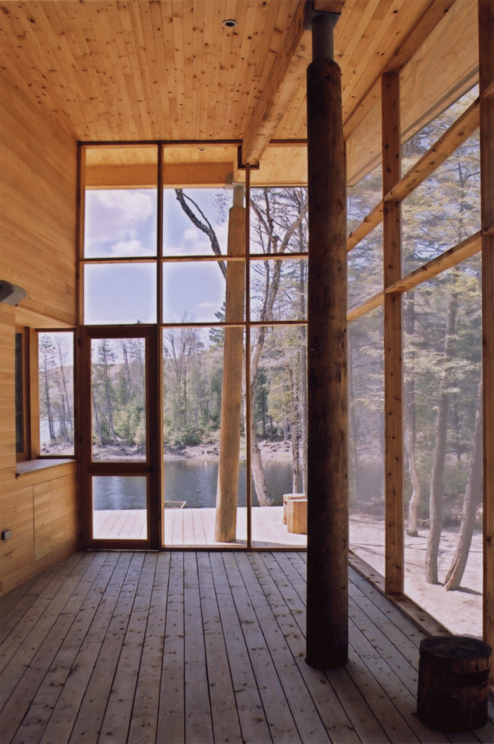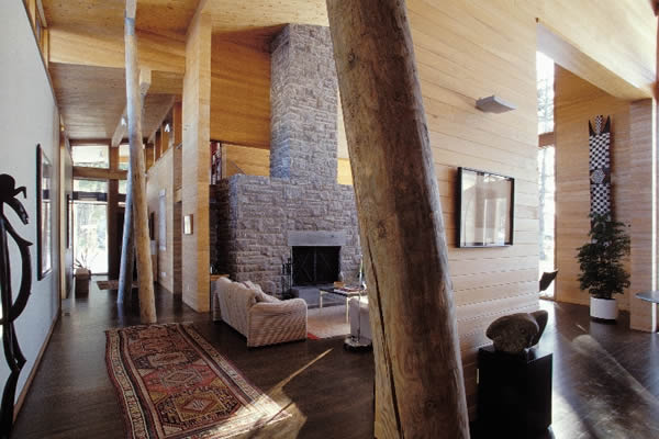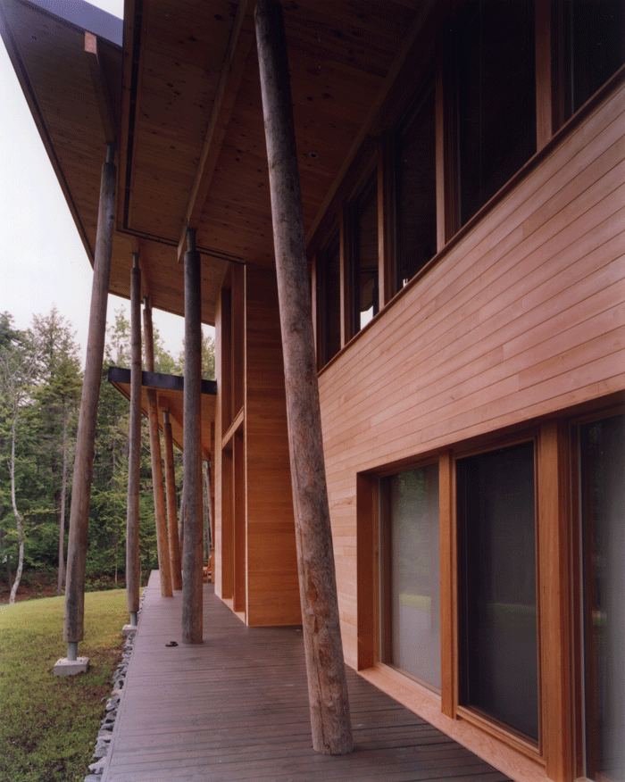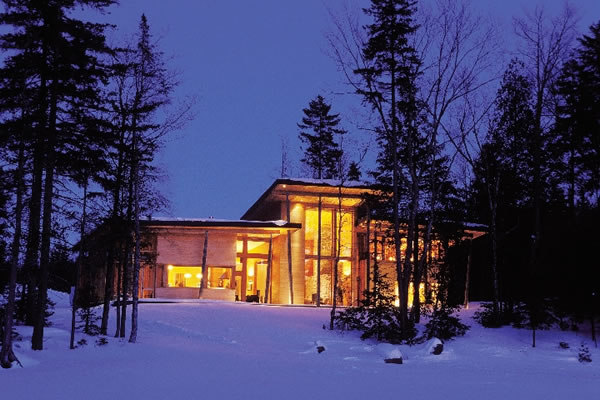 J’aime les arbres, j’aime la fôret et j’aime les maisons alors comment ne pas aimer celle-ci, qui illustre si bien le mariage entre l’architecture et la nature foisonnante tout en empruntant au savoir-faire des premiers habitants (référence à la palissade à l’arrière de la maison (ou plutôt à l’avant?) inspirée des réalisations d’il y a quelques siècles en territoire québécois). Construite en cédres et en rondins d’épinettes, elle représente bien notre réalité nordique. Cette oeuvre de Pierre Thibault s’en est suivi de plusieurs autres… mais celle-ci, avec sa balade intérieure en forêt, m’interpelle énormément! J’aimerais bien m’y promener…