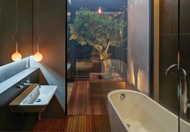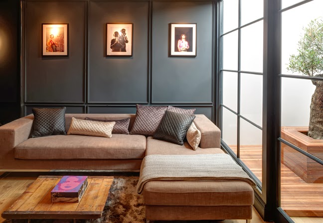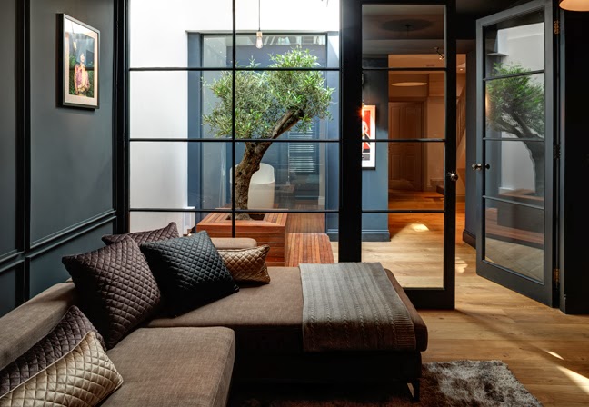 Parlant de cloison verrière, en voici un autre bel exemple dans ce salon, d’autant plus que les murs sont très sombres mais fort jolis. La même idée est reprise à la dernière photo, soit la salle de bain, mais avec une cloison totalement transparente cette fois-ci, donc de facture plus moderne. Mais c’est décidément la cuisine qui me fait craquer et la salle à manger! Peu à peu, je commence à m’habituer à la réintroduction de l’or et du laiton dans les cuisines, (et du cuivre, qui est plus facile à aimer!) après tant d’années de domination du stainless… Mais les poignées sont-elles réellement or? À moins que l’éclairage ne nous joue un tour!